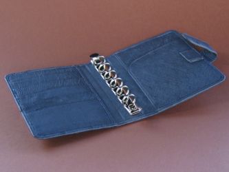 Exklusiver Terminplaner mit interessanter Oberflächenstruktur, Ringsystem Filofax, mit einem Dokumentenfach sowie fünf Kartenfächern auf der einen und einem Dokumentenfach auf der anderen Seite, Stifthalter und Lasche mit Druckknopf.